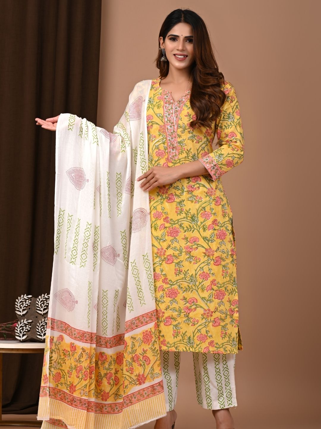 Purple Yellow Bagru Handblock Printed Mulmul Cotton Saree with Blouse