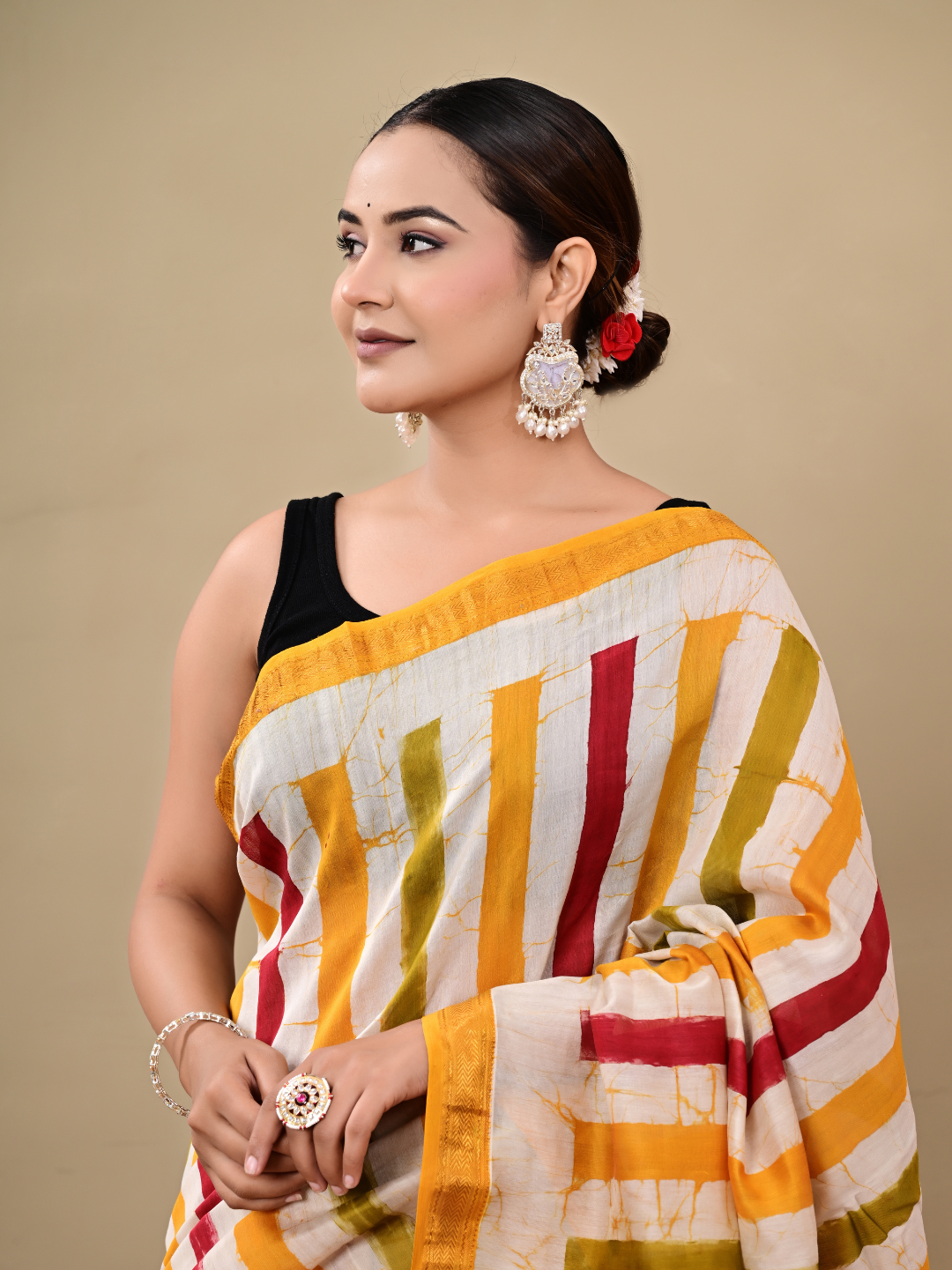 Add a burst of sunshine and heritage to your wardrobe with our Yellow Batik Maheshwari Silk Saree. A stunning blend of vibrant color and traditional artistry, this saree beautifully captures the essence of Indian handcraft in every detail.